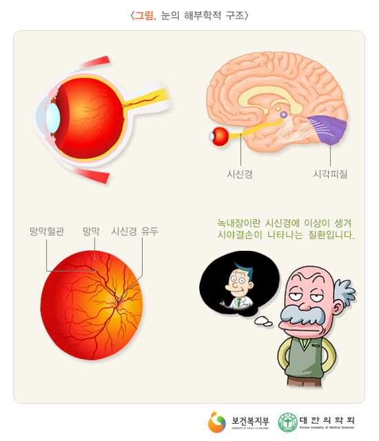 안압의 상승은 기계적으로 시신경을 압박하기도 하고, 시신경으로 가는 혈류의 흐름을 저하시켜 결국은 시야 손상이 진행돼 실명하게 됩니다.