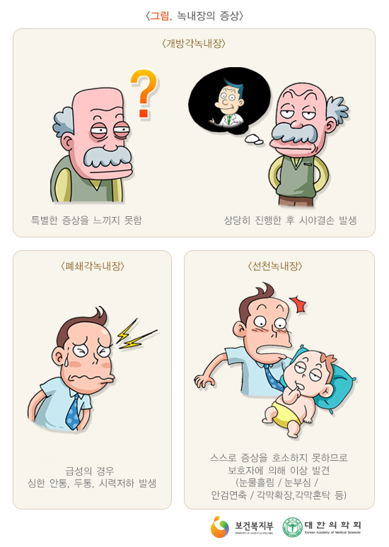 안압의 급격한 과다상승으로 인해 심한 안통 및 두통과 함께 시력저하가 발생합니다.