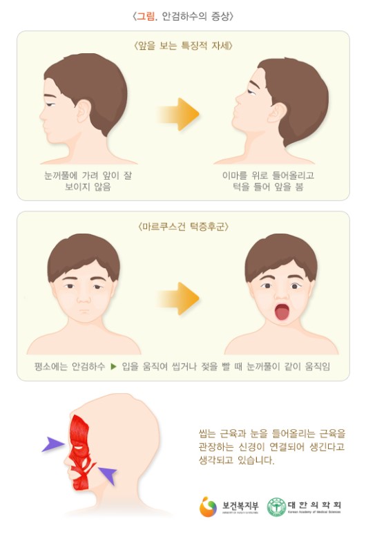 출생 직후부터 나타나는 선천 눈꺼풀처짐은 한쪽 또는 양쪽 위눈꺼풀이 아래로 처져서 검은 눈동자 (각막)가 제대로 보이지 않습니다. 선천 눈꺼풀처짐이 있는 영유아의 경우 정면의 사물을 보기 위해 이마를 위로 치켜 뜨고 턱을 위로 들어올리게 됩니다.